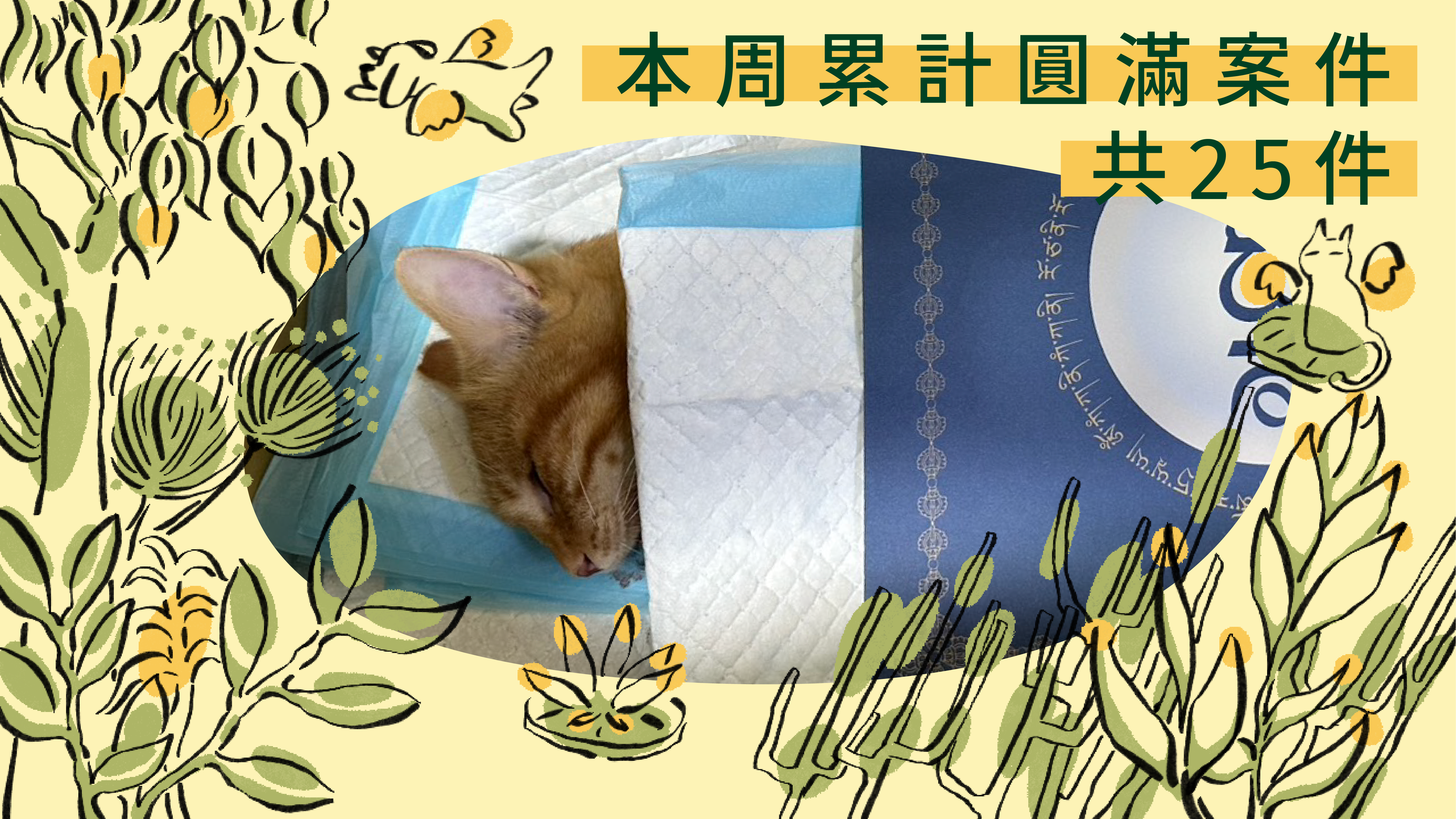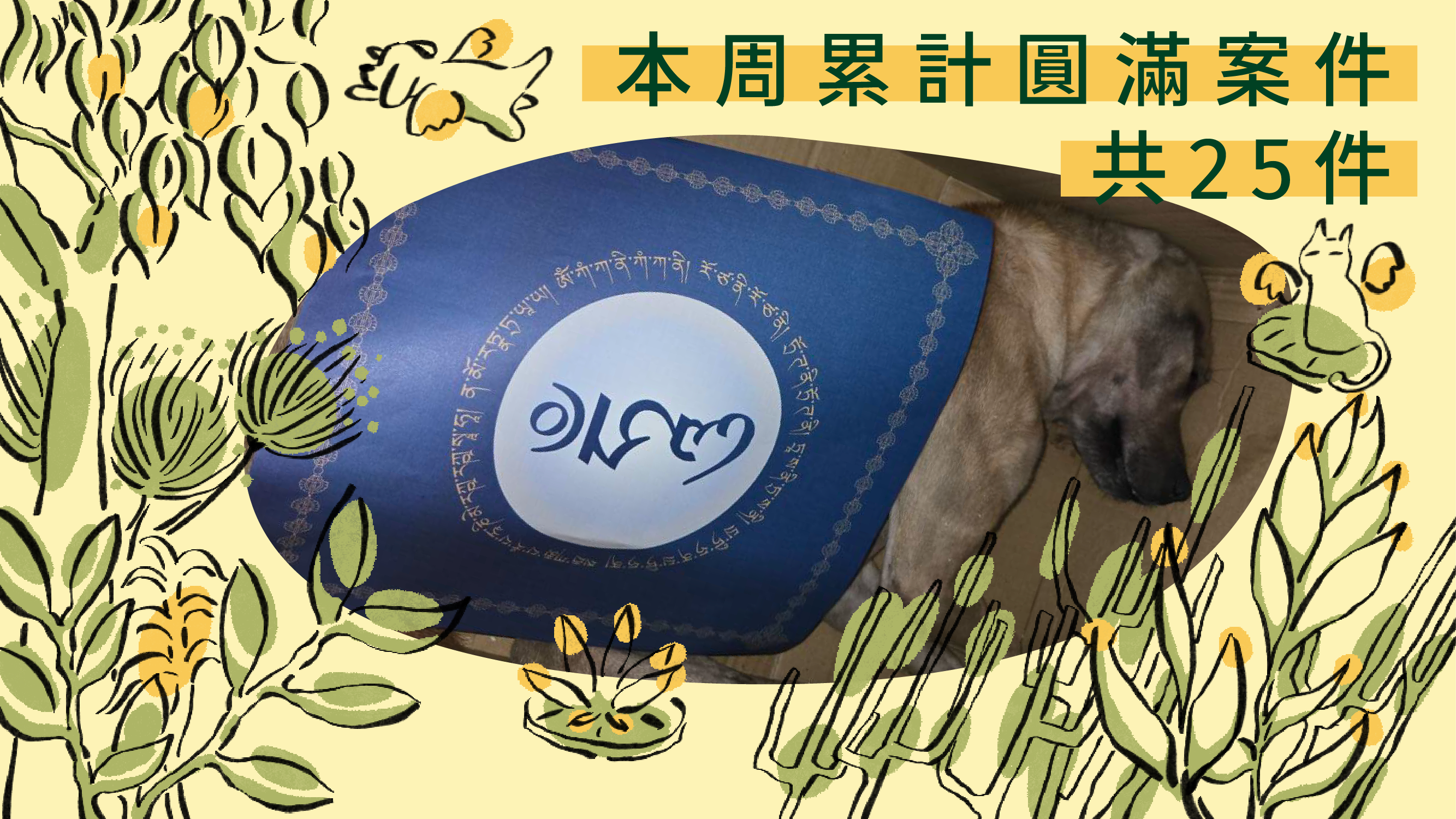 本周累計圓滿案件共 25 件,為本週火化的浪浪們進行藥懺法會,透過不動如來的庇護,祝願他們離苦得樂,下輩子不再流浪,特別感謝下列善心通報民眾: