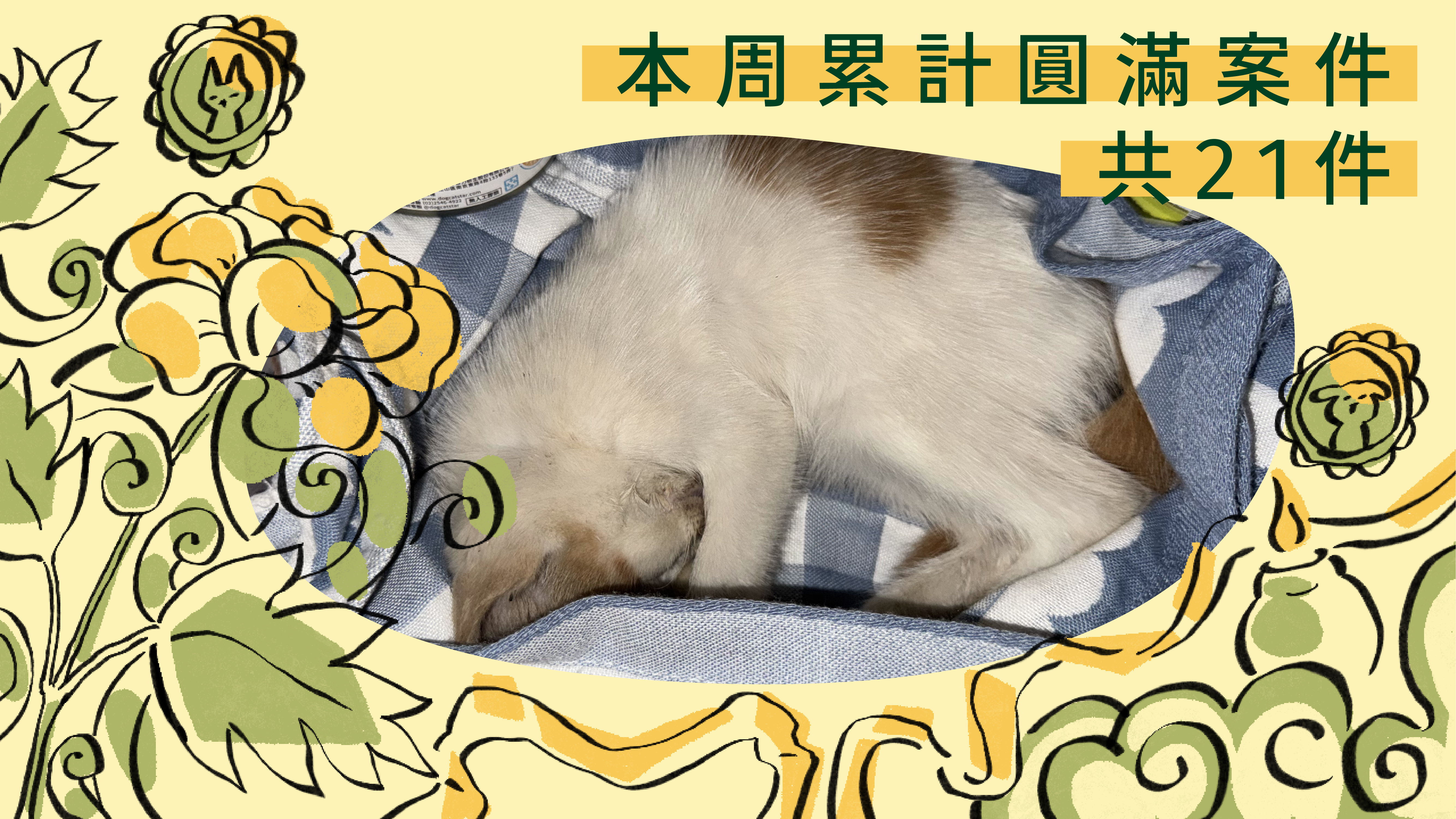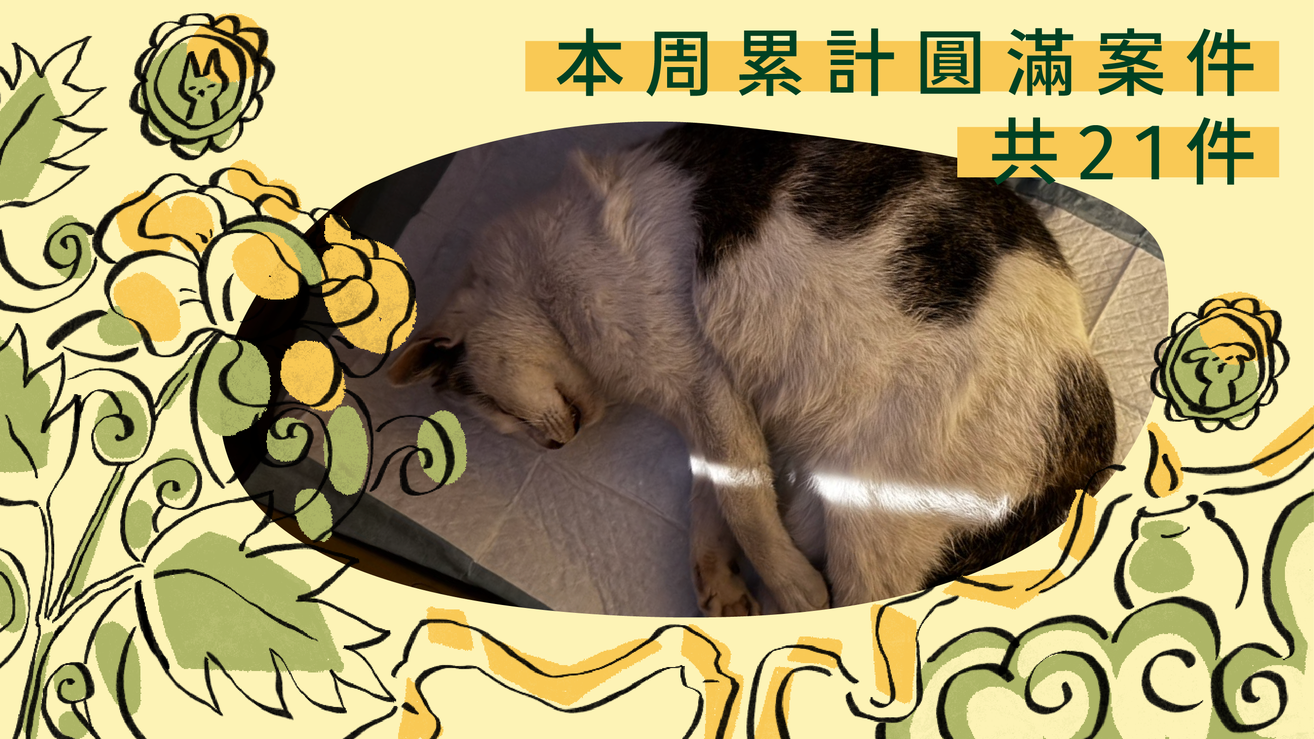 本周累計圓滿案件共 21 件,為本週火化的浪浪們進行藥懺法會,透過不動如來的庇護,祝願他們離苦得樂,下輩子不再流浪,特別感謝下列善心通報民眾: