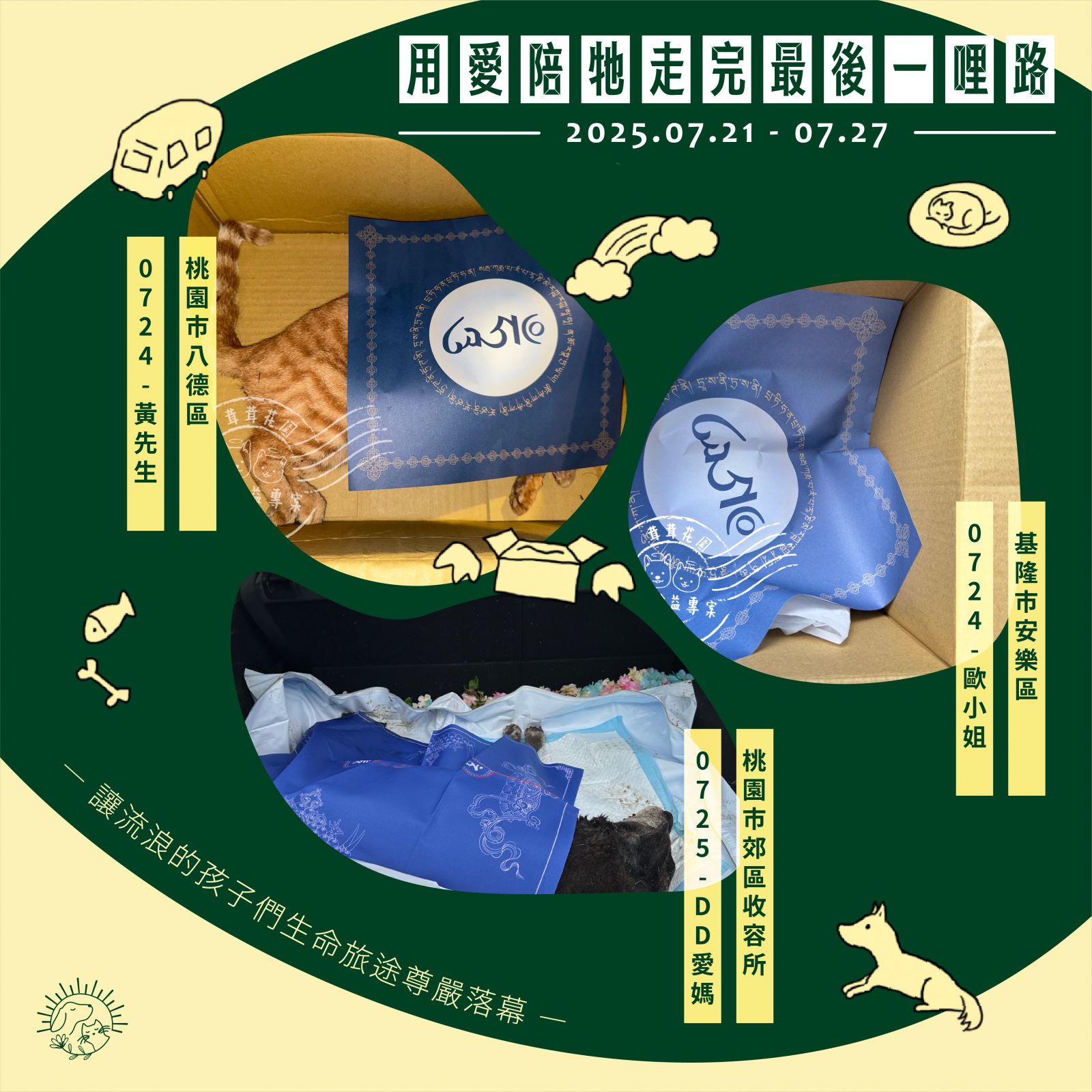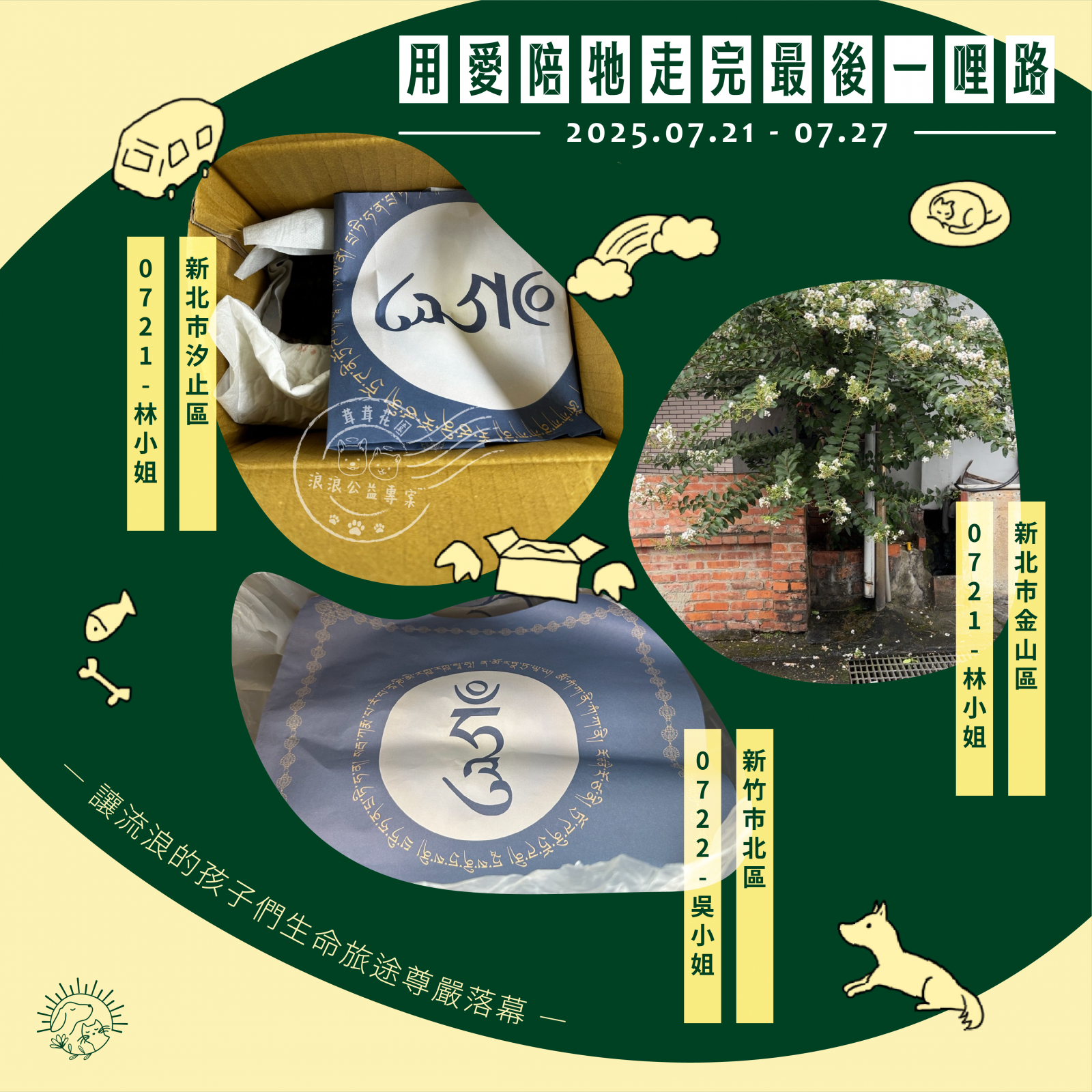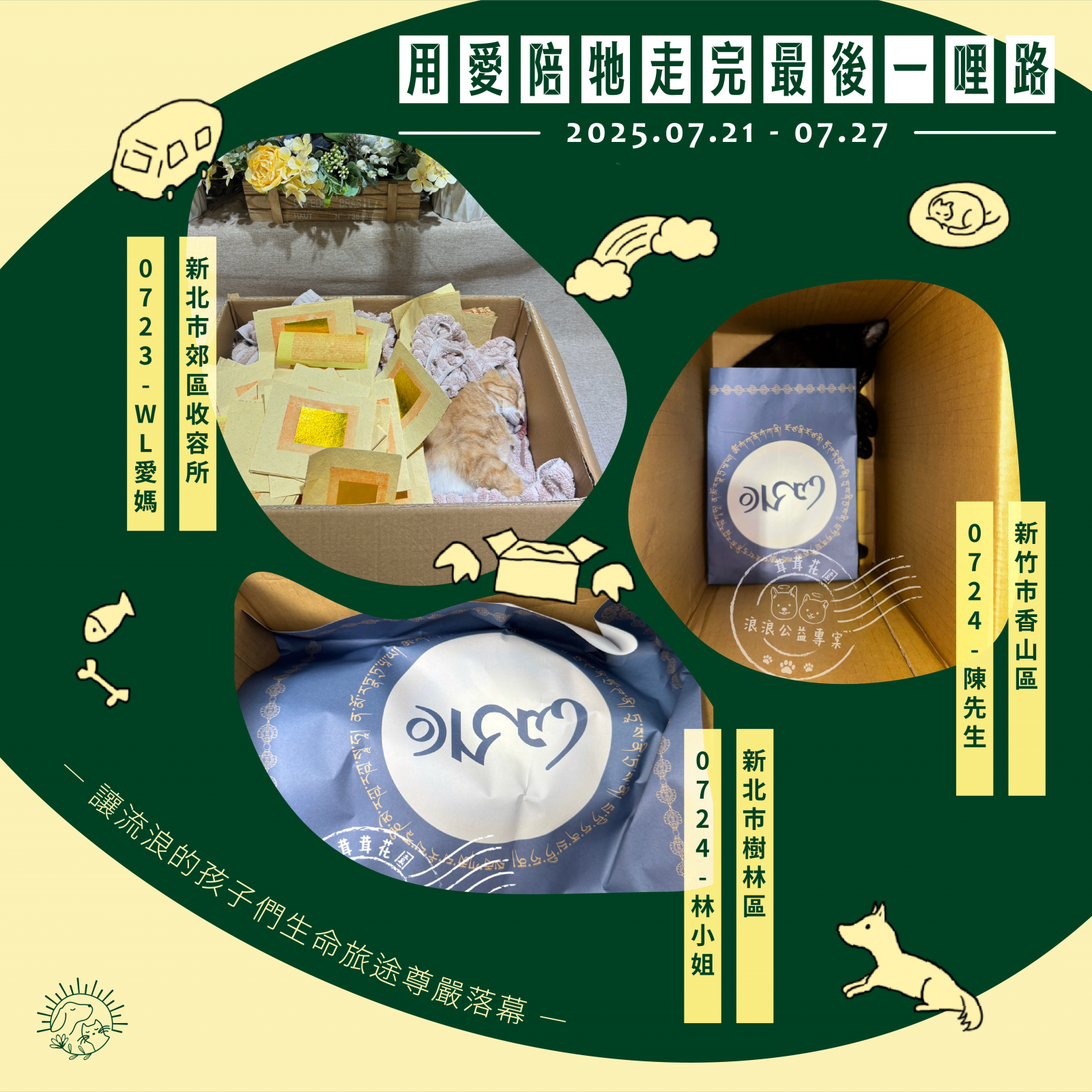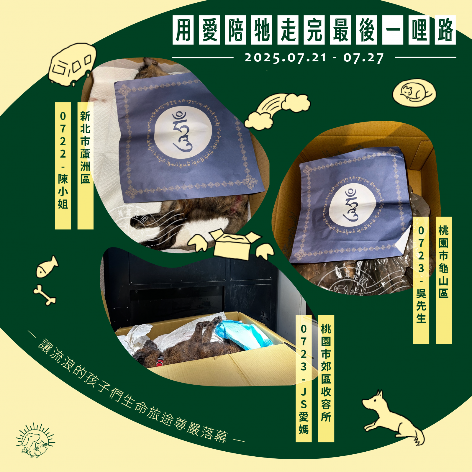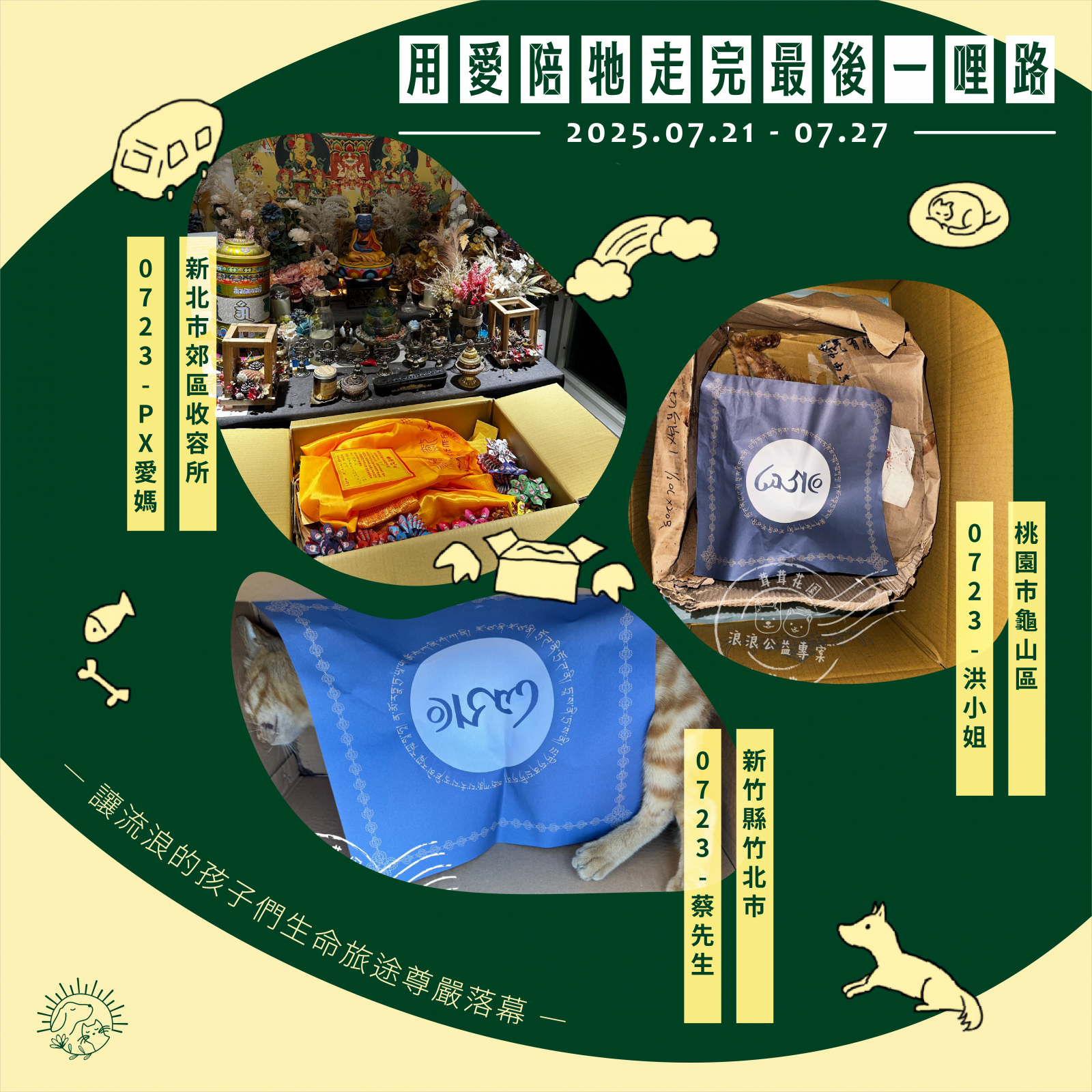 🌼以上案件皆在 7/27 火化完畢,並於 7/28 完成藥懺法事圓滿及灑葬,透過不動如來的庇護,祝願他們離苦得樂,下輩子不再流浪。每個案件我們會親自負責,將每位浪浪「接體—火化—灑葬—祝福」一條龍照護,為他們的來世的安樂造福鋪路。