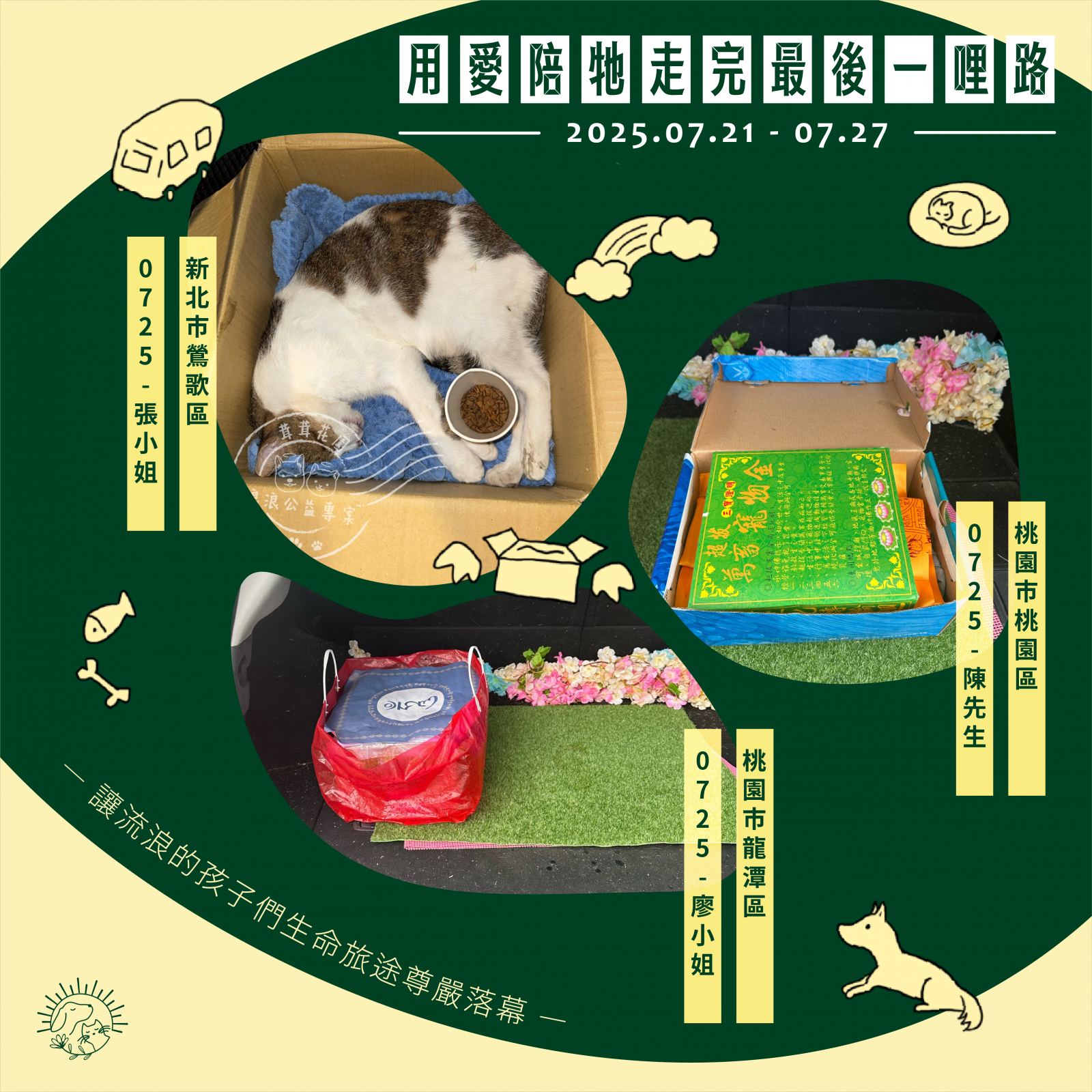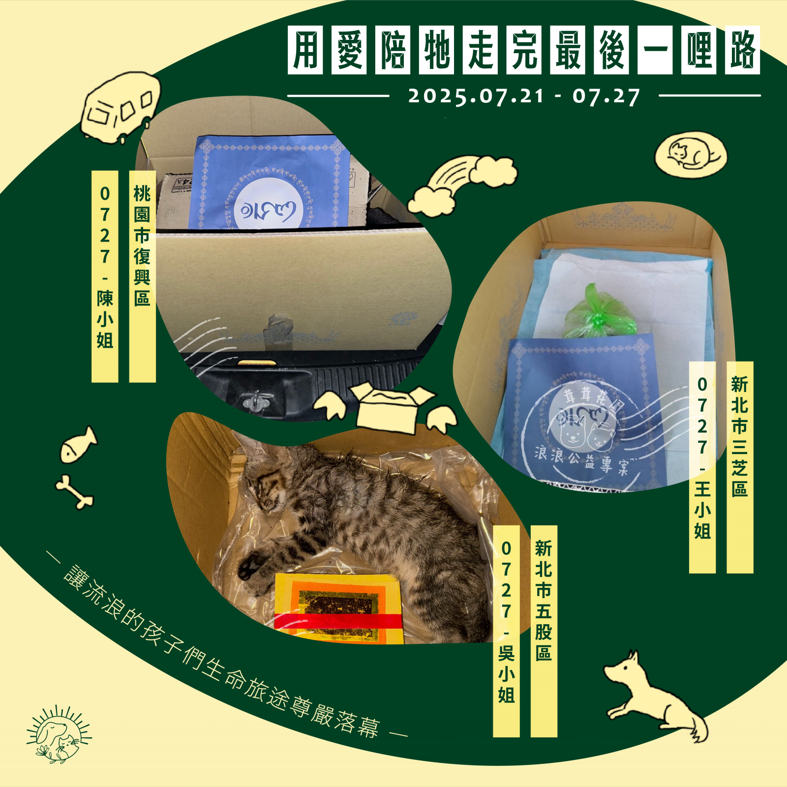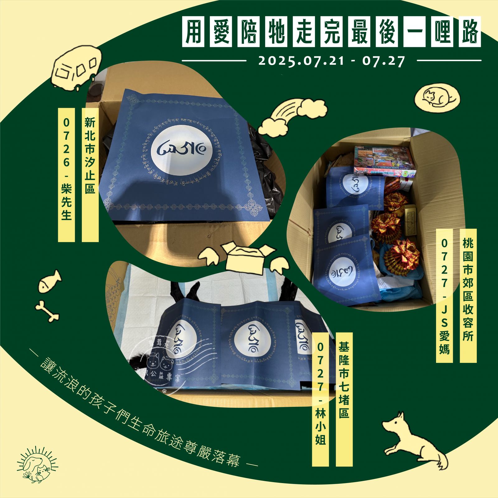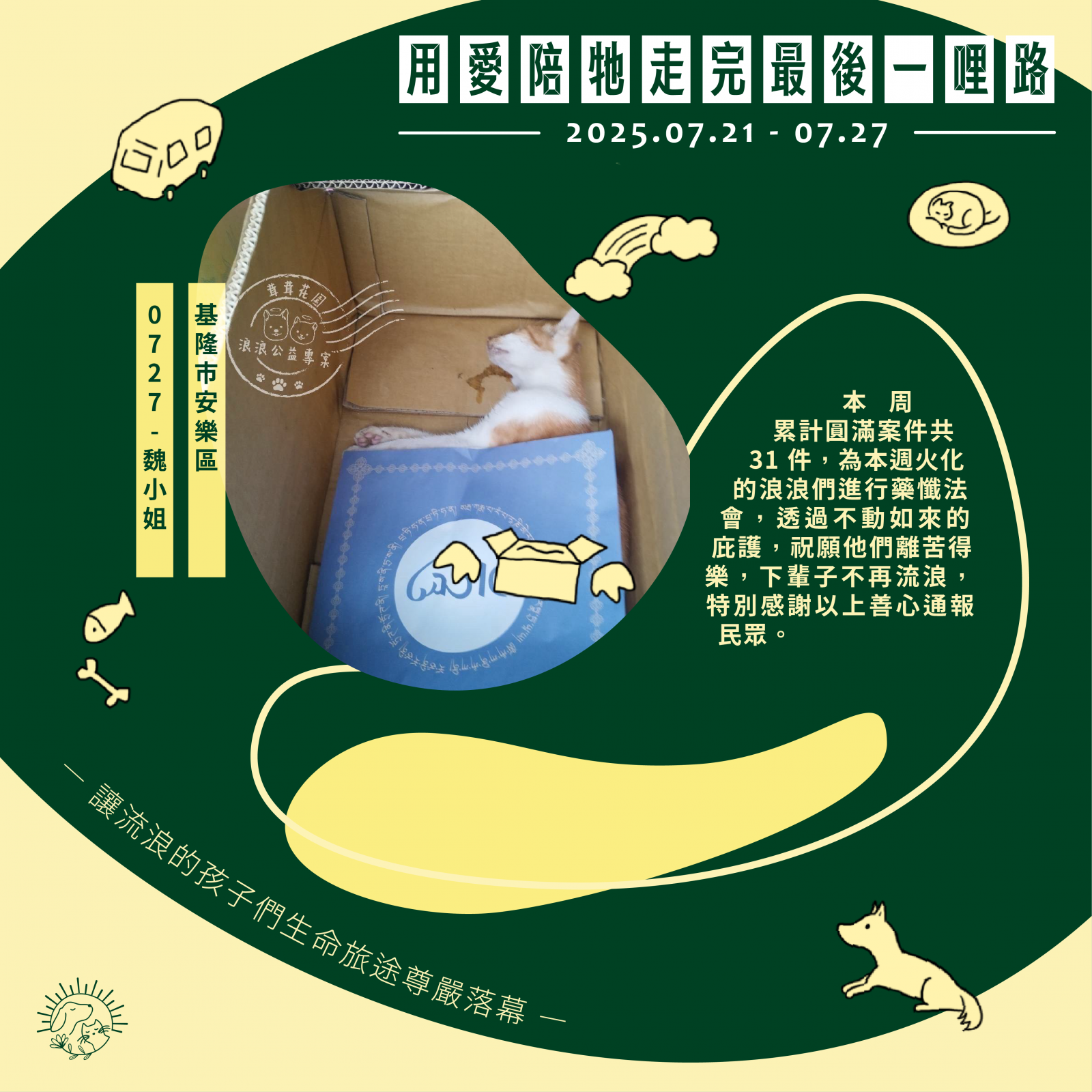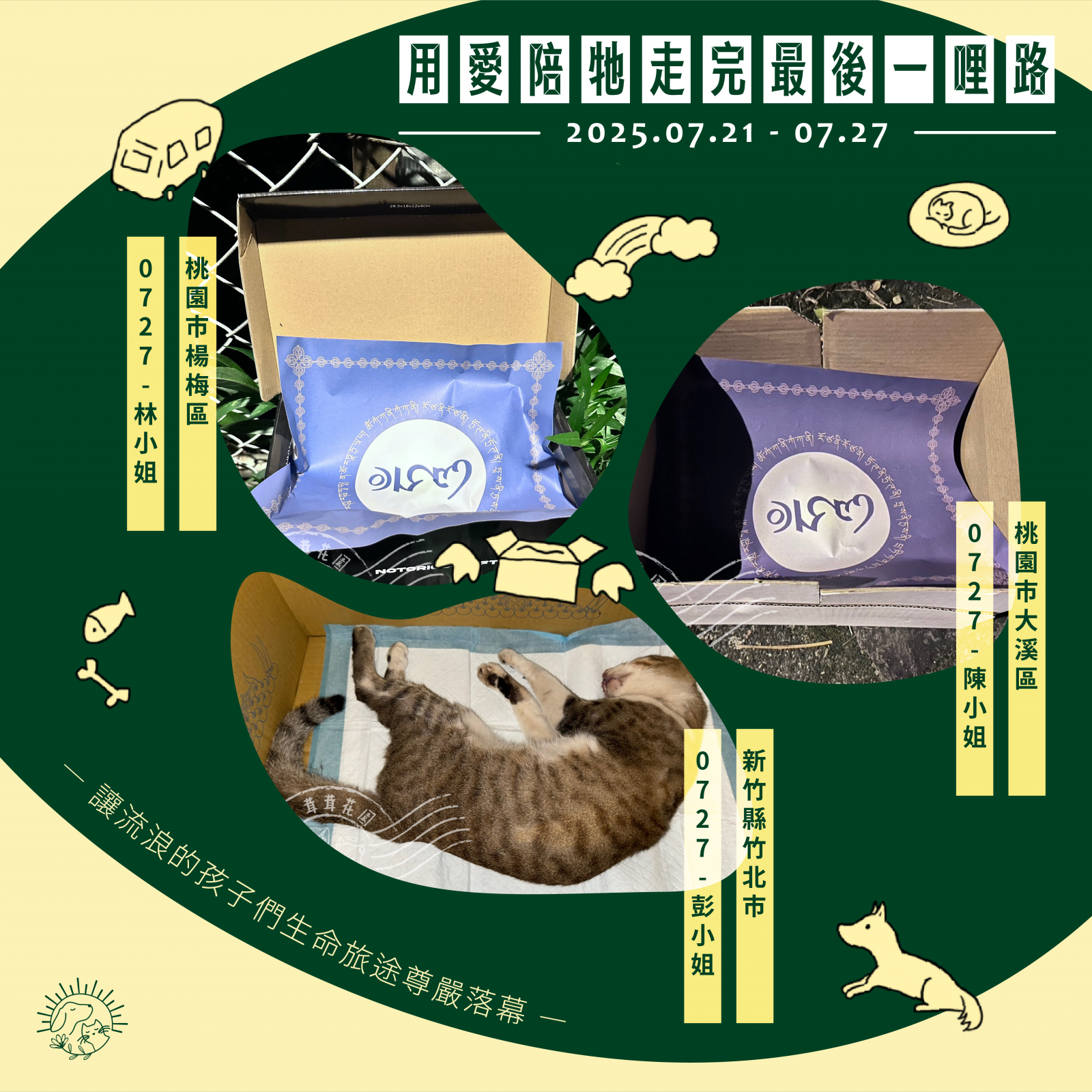 🌼以上案件皆在 7/27 火化完畢,並於 7/28 完成藥懺法事圓滿及灑葬,透過不動如來的庇護,祝願他們離苦得樂,下輩子不再流浪。每個案件我們會親自負責,將每位浪浪「接體—火化—灑葬—祝福」一條龍照護,為他們的來世的安樂造福鋪路。