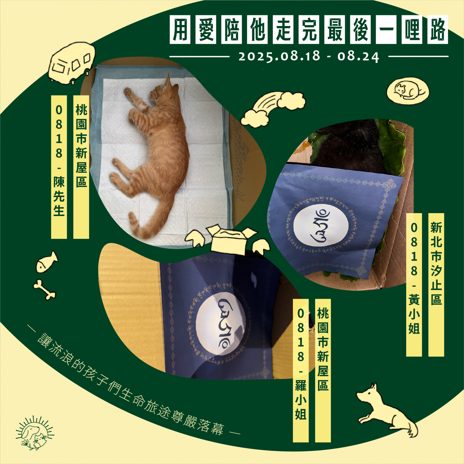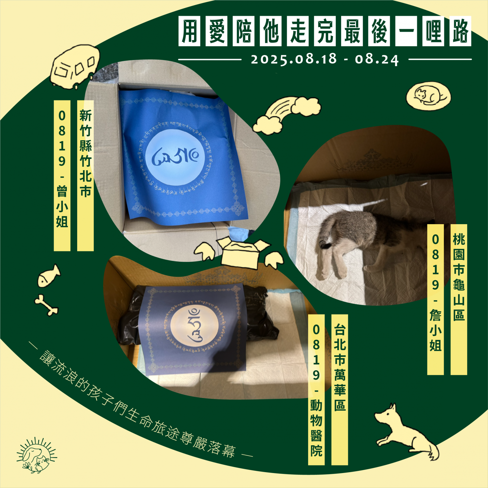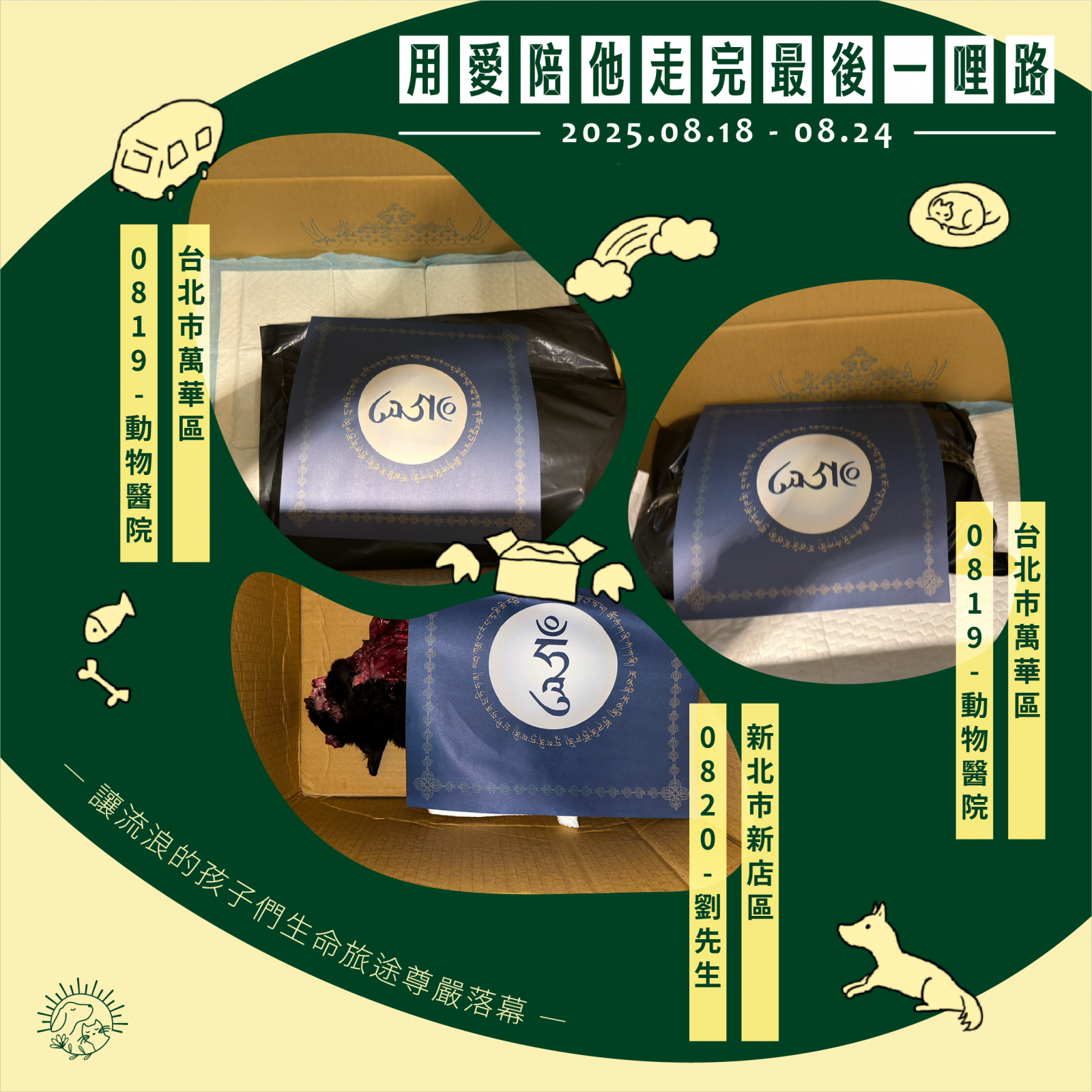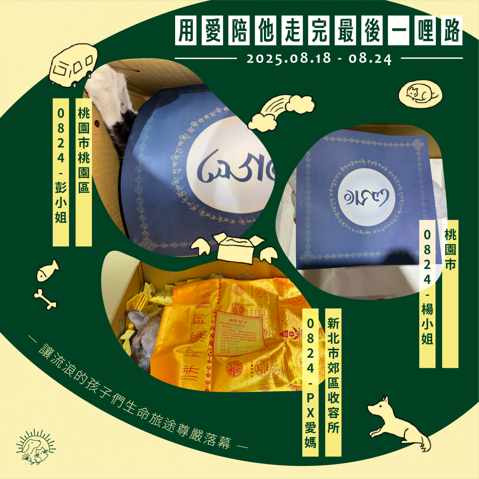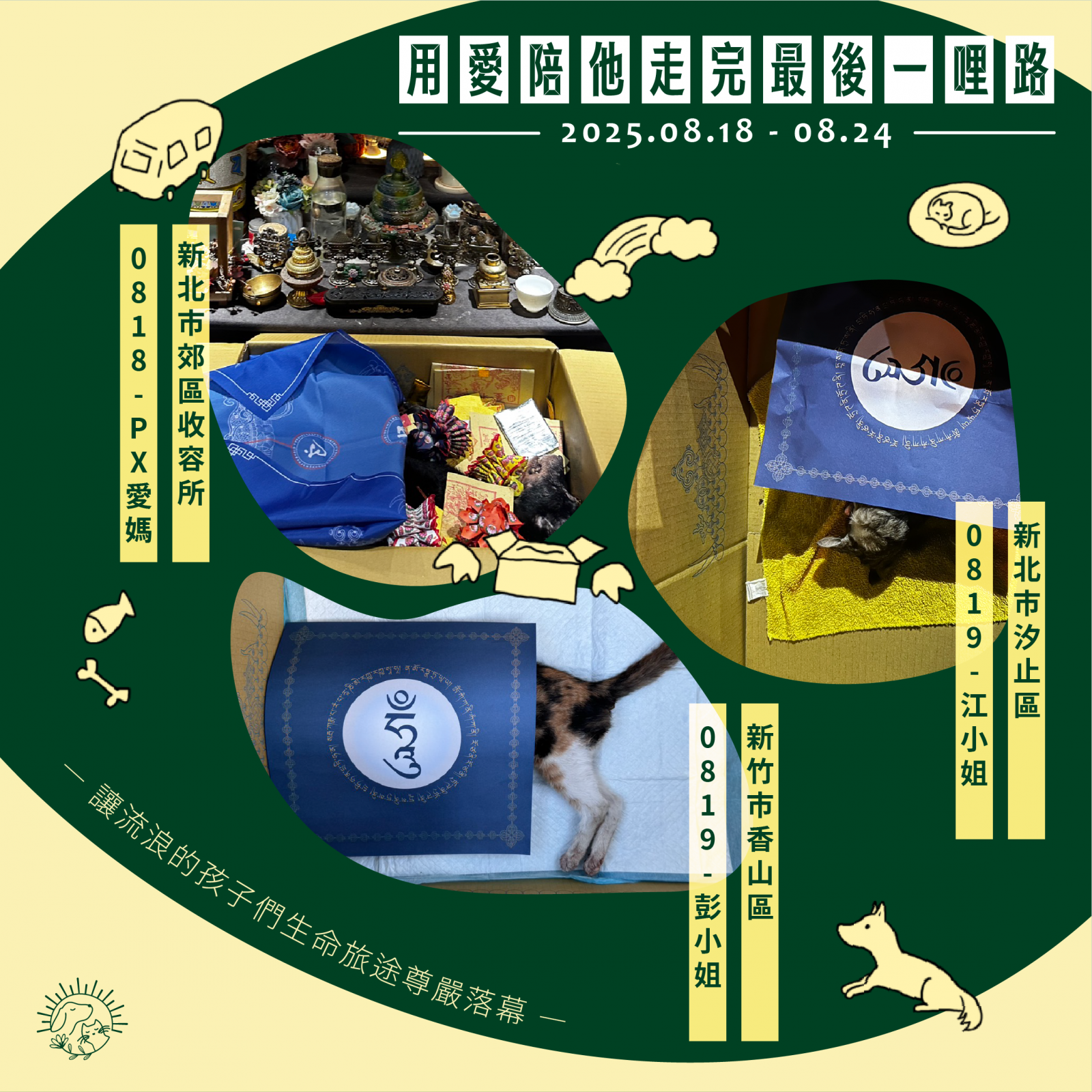 🌼以上案件皆在 8/24 火化完畢,並於 8/25 完成藥懺法事圓滿及灑葬,透過不動如來的庇護,祝願他們離苦得樂,下輩子不再流浪。每個案件我們會親自負責,將每位浪浪「接體—火化—灑葬—祝福」一條龍照護,為他們的來世的安樂造福鋪路。