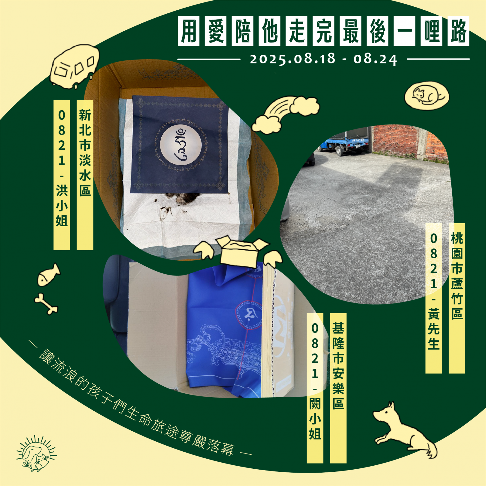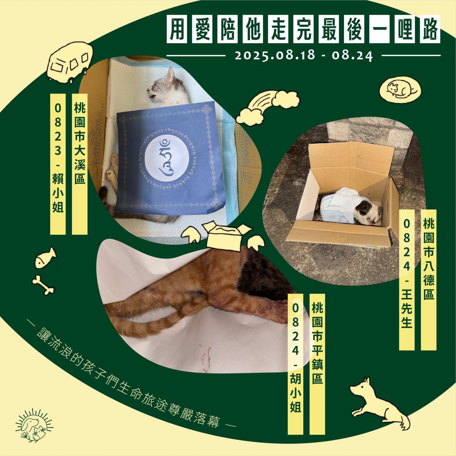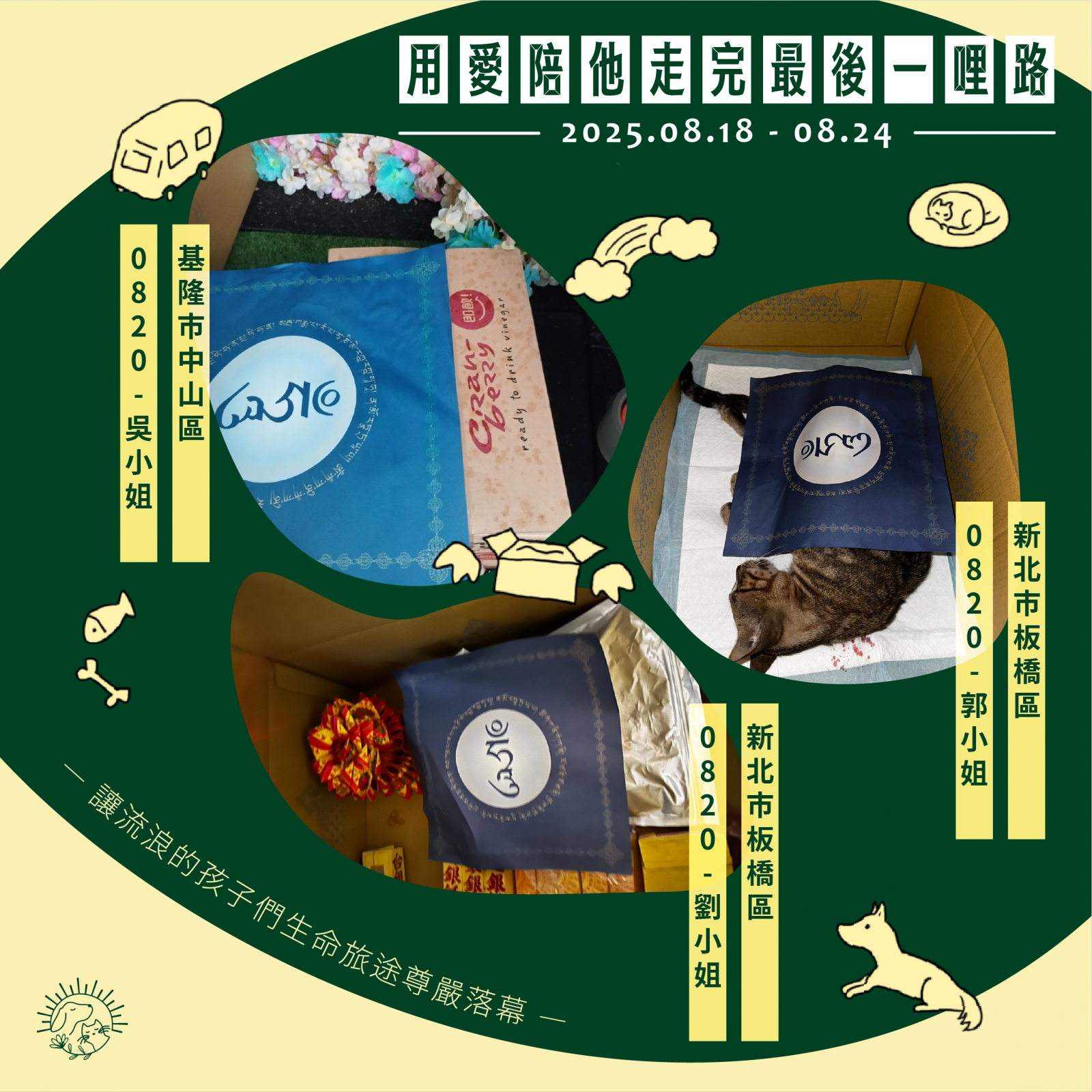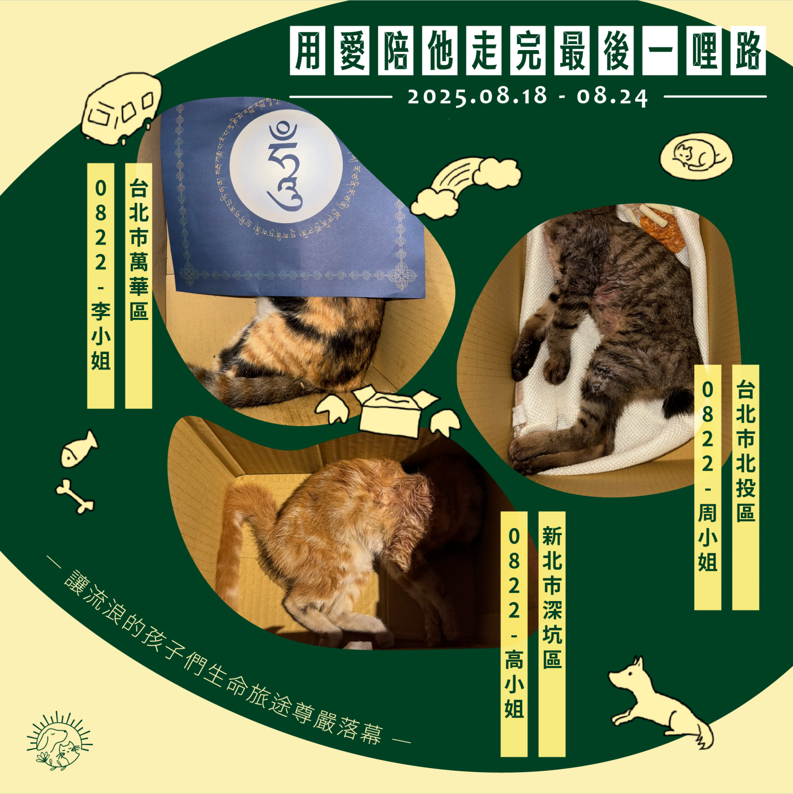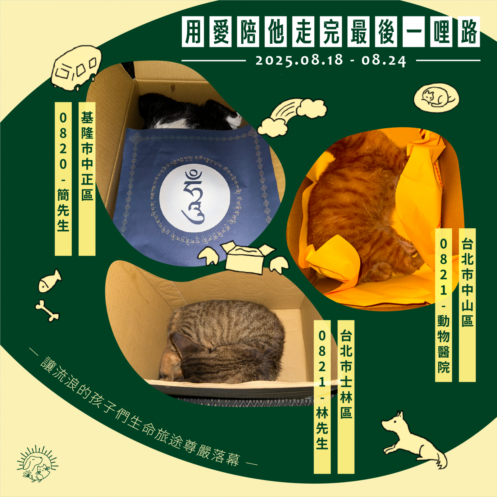 🌼以上案件皆在 8/24 火化完畢,並於 8/25 完成藥懺法事圓滿及灑葬,透過不動如來的庇護,祝願他們離苦得樂,下輩子不再流浪。每個案件我們會親自負責,將每位浪浪「接體—火化—灑葬—祝福」一條龍照護,為他們的來世的安樂造福鋪路。