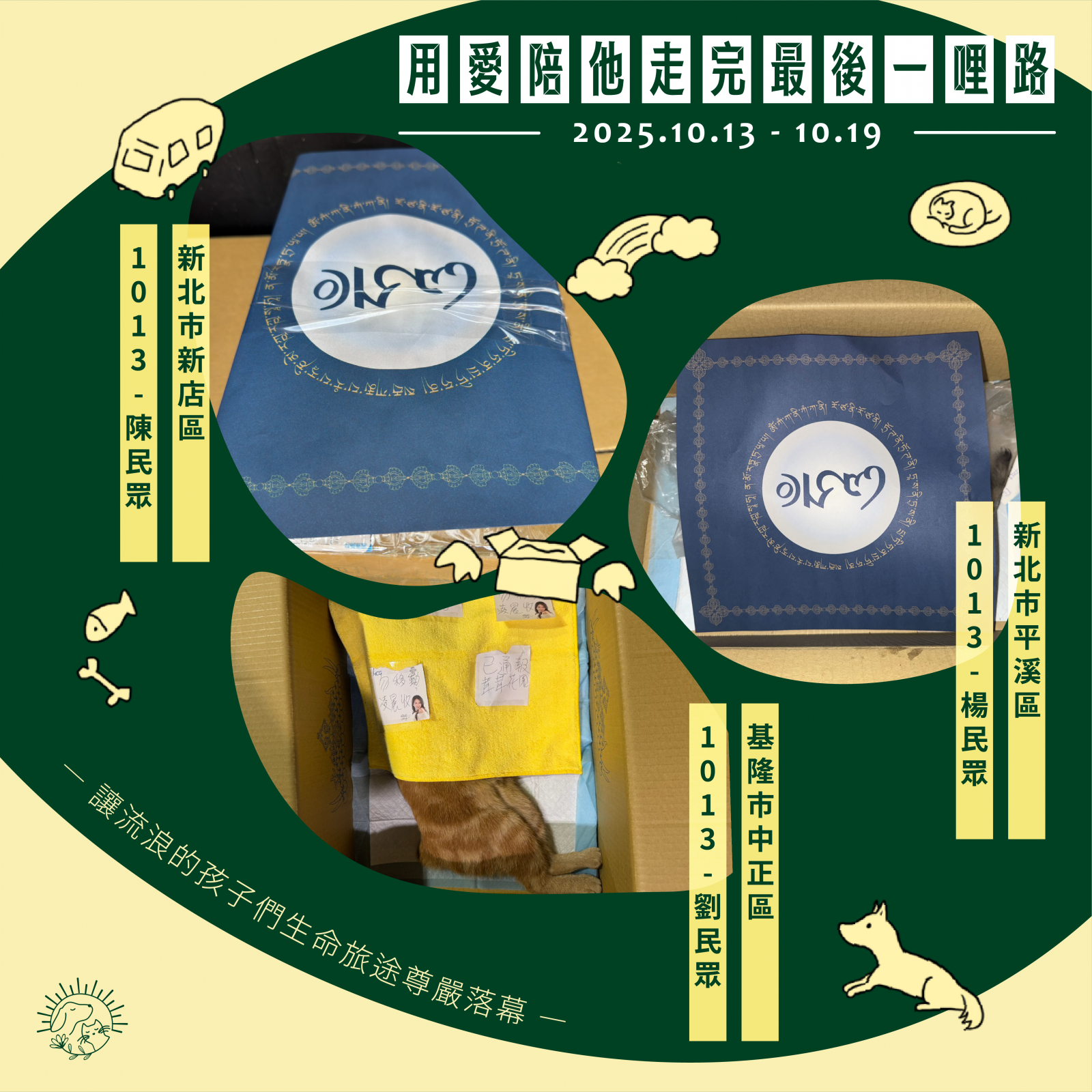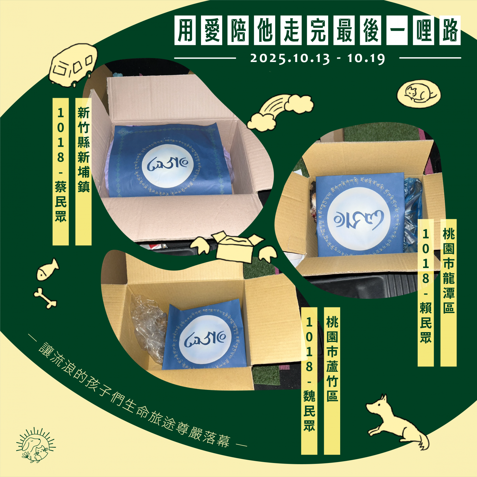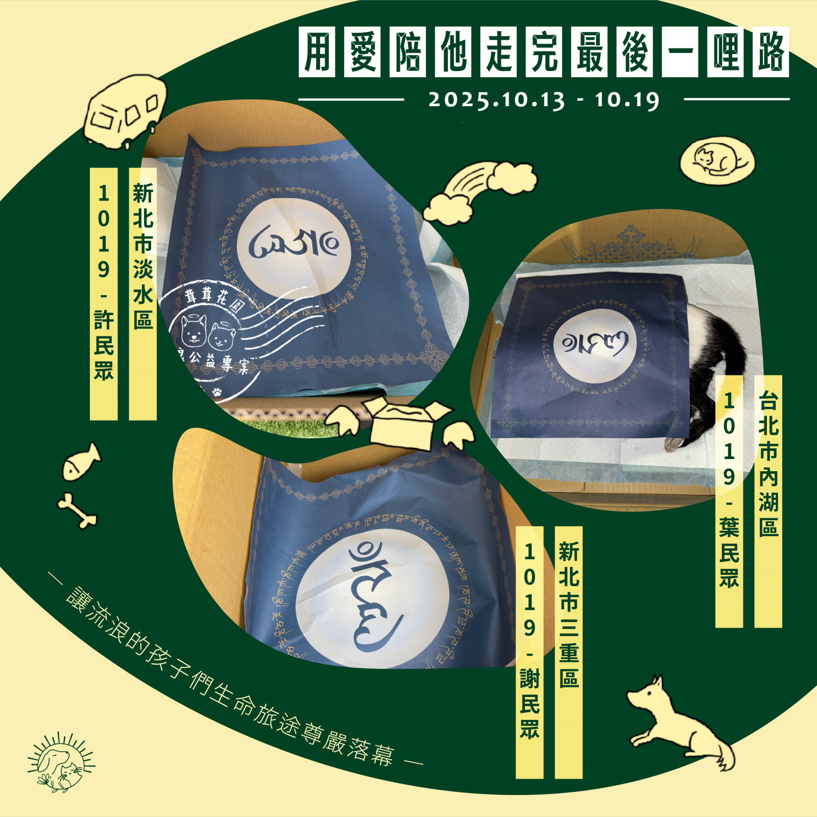 🌼以上案件皆在 10/19 火化完畢,並於 10/20 完成藥懺法事圓滿及灑葬,透過不動如來的庇護,祝願他們離苦得樂,下輩子不再流浪。每個案件我們會親自負責,將每位浪浪「接體—火化—灑葬—祝福」一條龍照護,為他們的來世的安樂造福鋪路。