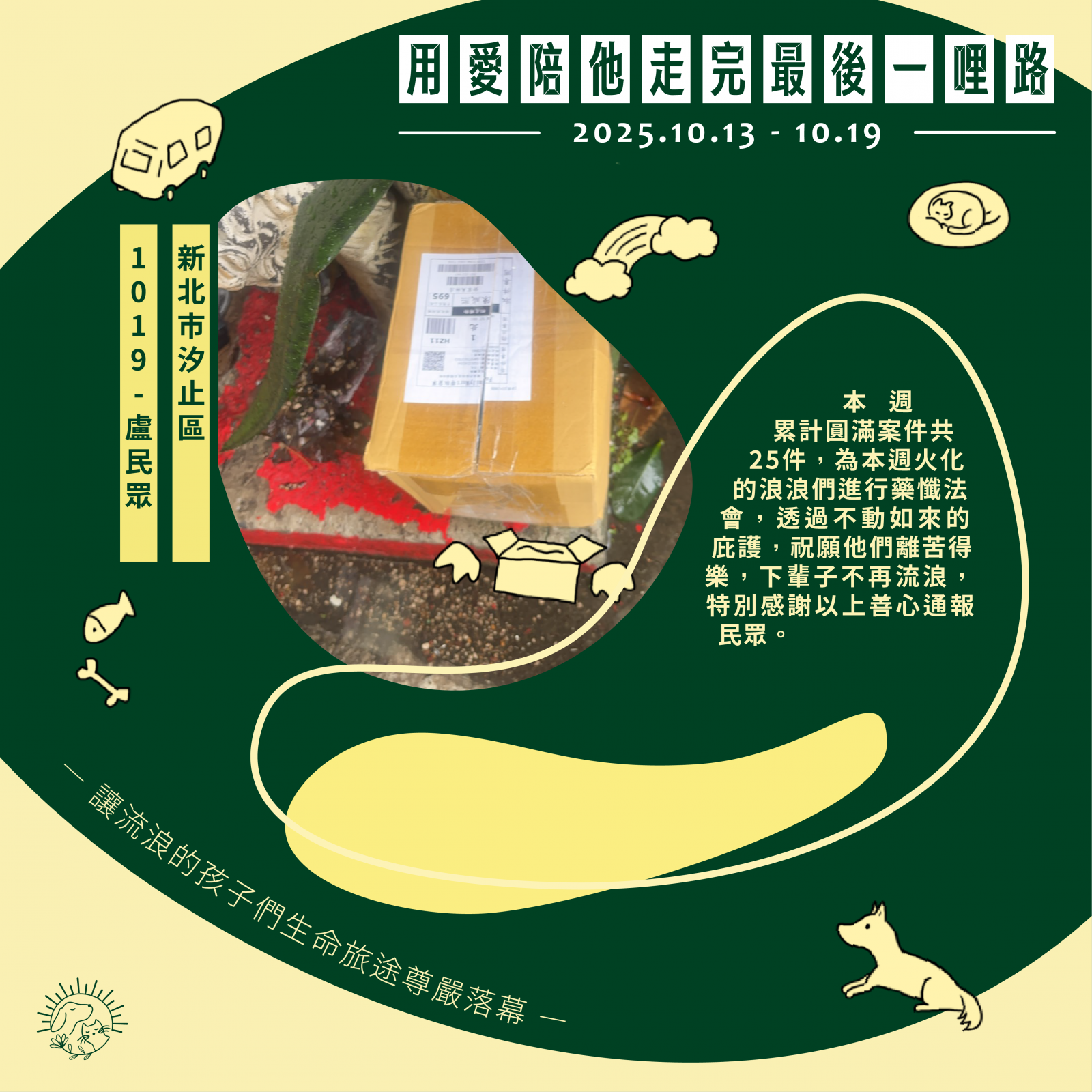 🙏本周累計圓滿案件共 25 件,為本週火化的浪浪們進行藥懺法會,透過不動如來的庇護,祝願他們離苦得樂,下輩子不再流浪,特別感謝下列善心通報民眾: