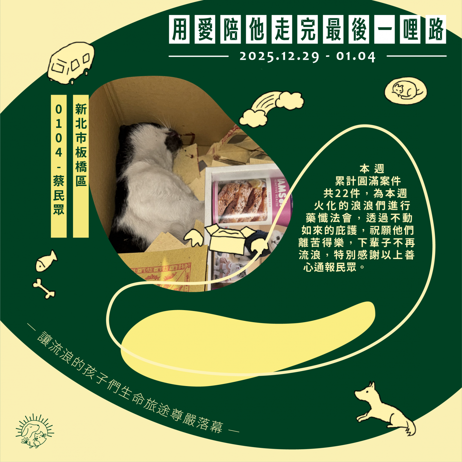 🙏本周累計圓滿案件共 22 件,為本週火化的浪浪們進行藥懺法會,透過不動如來的庇護,祝願他們離苦得樂,下輩子不再流浪,特別感謝下列善心通報民眾: