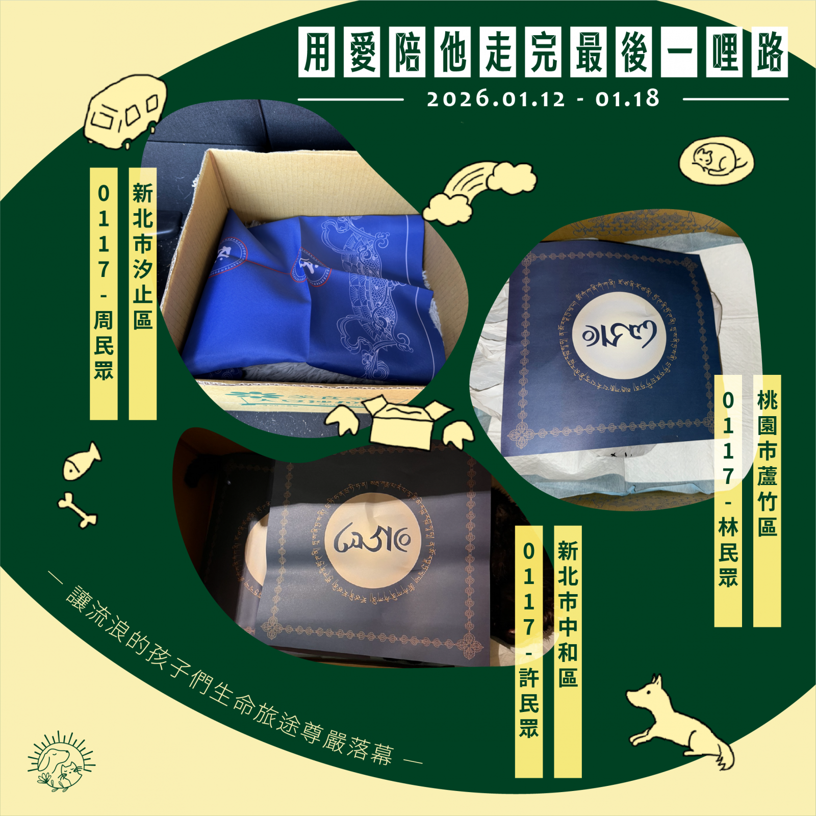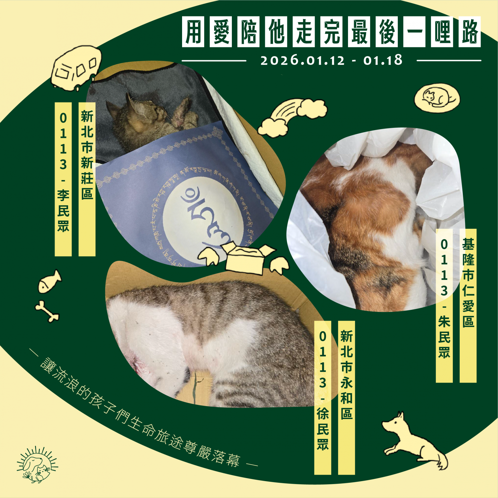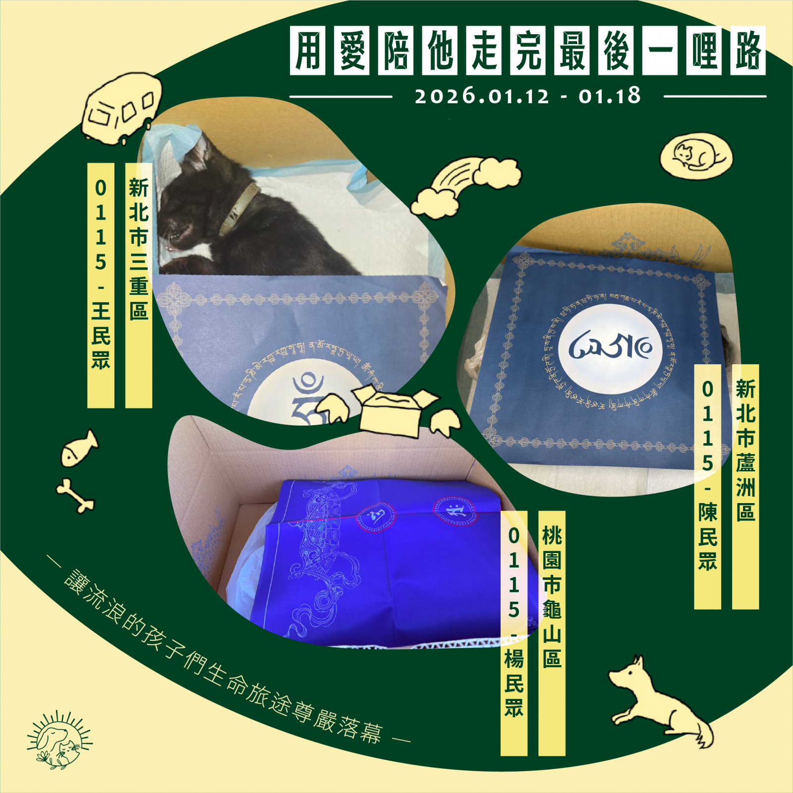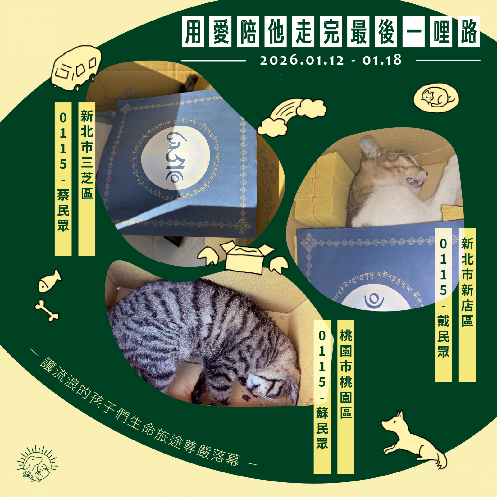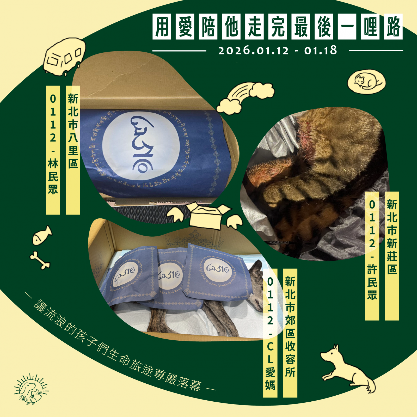 🌼以上案件皆在 1/18 火化完畢,並於 1/19 完成藥懺法事圓滿及灑葬,透過不動如來的庇護,祝願他們離苦得樂,下輩子不再流浪。每個案件我們會親自負責,將每位浪浪「接體—火化—灑葬—祝福」一條龍照護,為他們的來世的安樂造福鋪路。