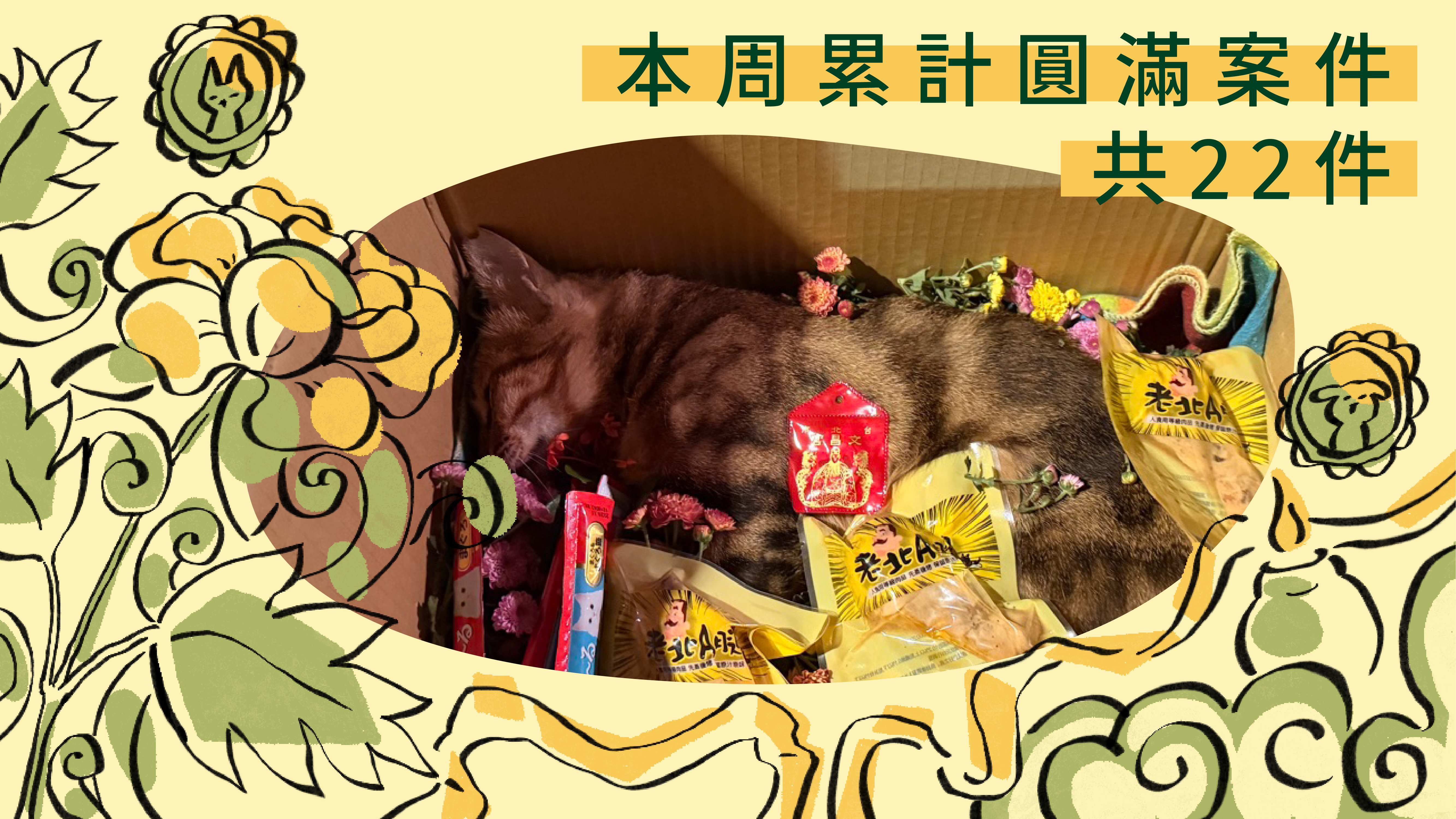 本周累計圓滿案件共 22 件,為本週火化的浪浪們進行藥懺法會,透過不動如來的庇護,祝願他們離苦得樂,下輩子不再流浪,特別感謝下列善心通報民眾: