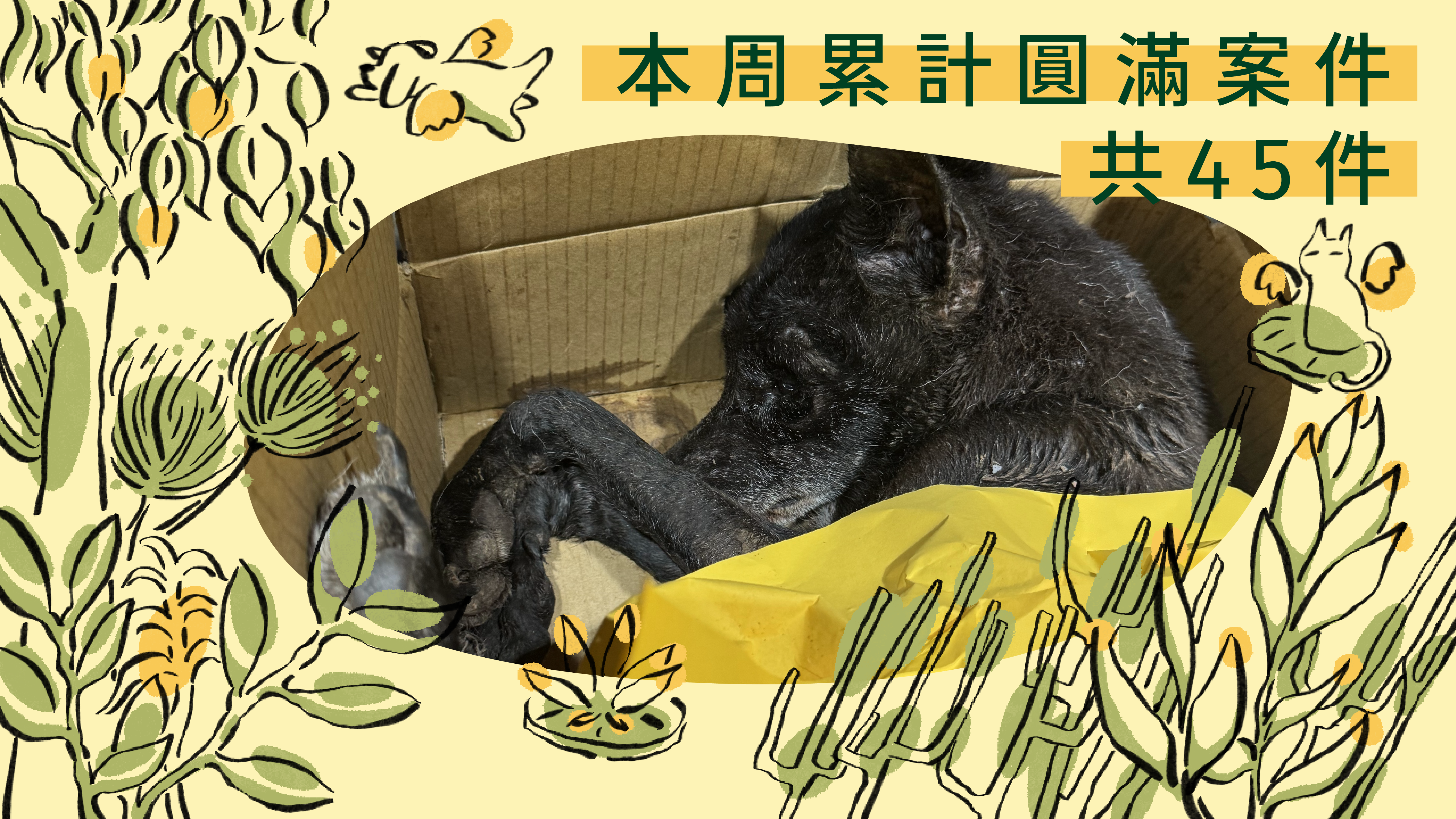 本周累計圓滿案件共 45 件,為本週火化的浪浪們進行藥懺法會,透過不動如來的庇護,祝願他們離苦得樂,下輩子不再流浪,特別感謝下列善心通報民眾: