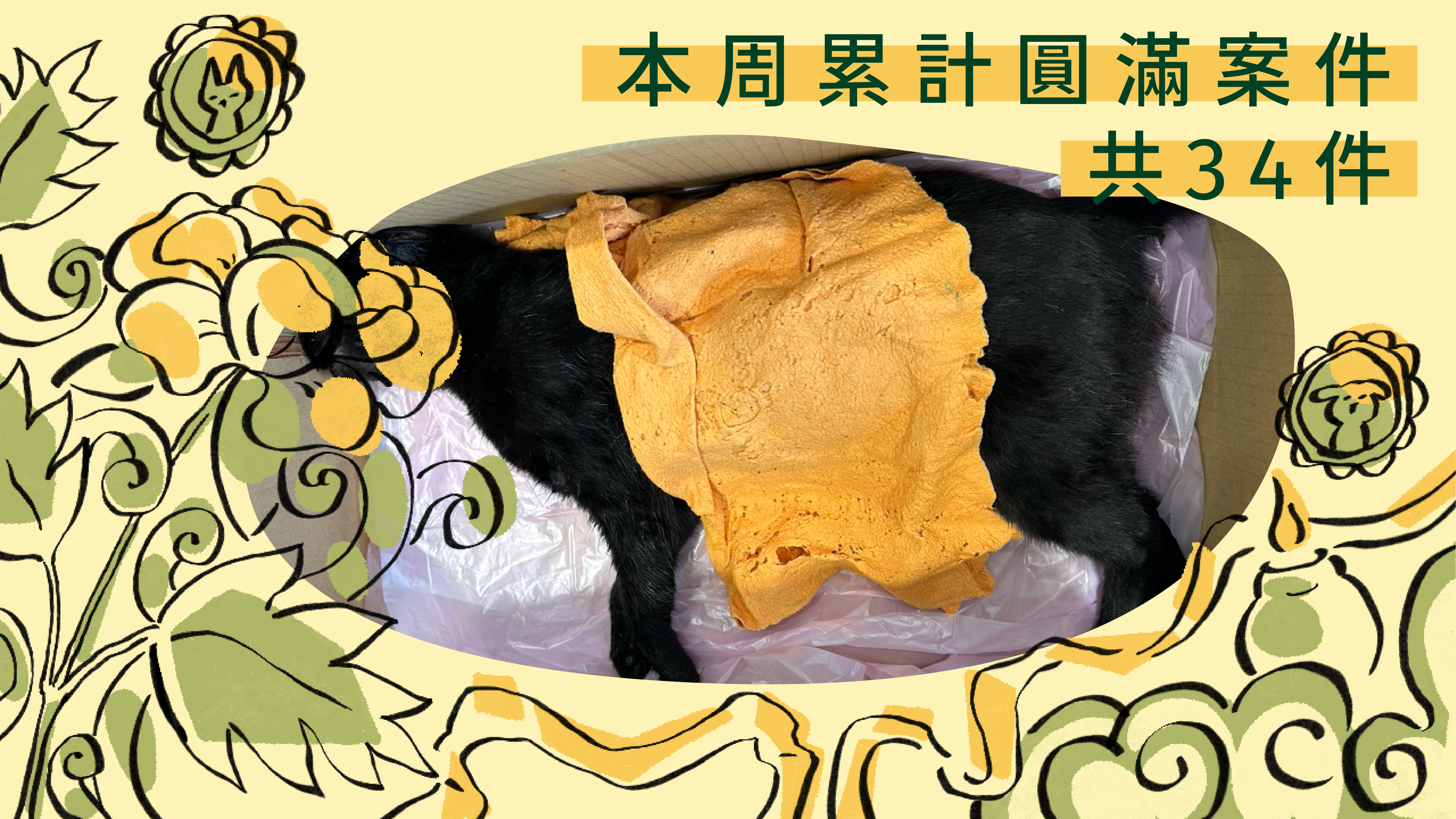 本周累計圓滿案件共 34 件,為本週火化的浪浪們進行藥懺法會,透過不動如來的庇護,祝願他們離苦得樂,下輩子不再流浪,特別感謝下列善心通報民眾: